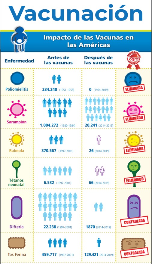 Cada año, en América Latina y en el Caribe las vacunas previenen 175 000 muertes en niños menores de 5 años. Gracias a las vacunas, enfermedades como polio, sarampión, rubeola, tétanos en bebés y viruela han sido eliminadas en las Américas.